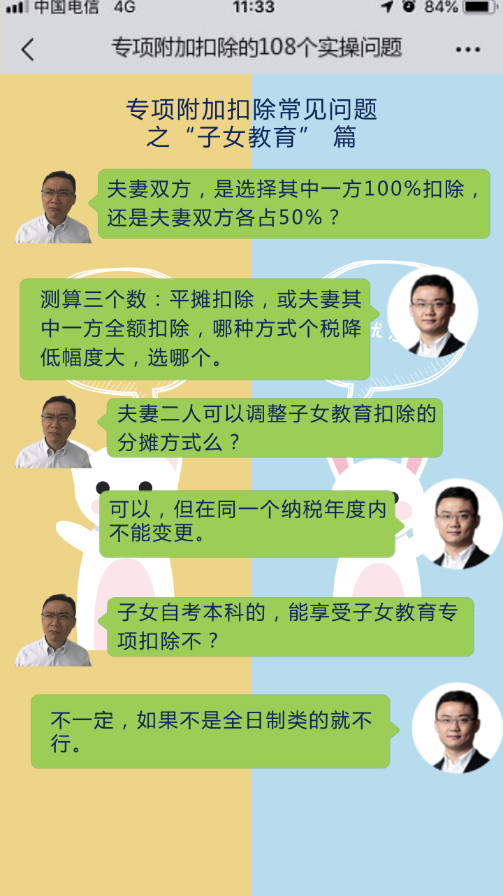 國務院日前正式發布《個人所得稅專項附加扣除暫行辦法》,這標志著我國綜合與分類相結合的個稅改革邁出關鍵一步。與此同時,國家稅務總局發布《個人所得稅專項附加扣除操作辦法(試行)》,自2019年1月1日起施行。今后納稅人計算個稅應納稅所得額在5000元基本減除費用扣除和“三險一金”等專項扣除外,還可享受子女教育、繼續教育、大病醫療、住房貸款利息或住房租金,以及贍養老人等6項專項附加扣除。那么,6項專項附加扣除的范圍及條件在現實生問題中應該如何解讀呢?今天起,正保會計網校羅杰夫老師將通過微信對話的展現方式為您逐一解答。