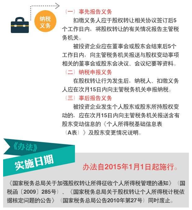 日前,國家稅務總局發(fā)布了《股權轉讓所得個人所得稅管理辦法(試行)》并自2015年1月1日起施行。為啥出臺該《辦法》?《辦法》的適用范圍是什么?《辦法》的主要內容又包括什么?一圖讀懂。