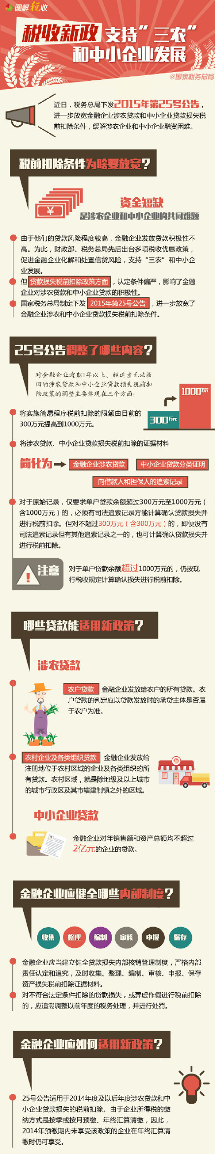 近日,稅務總局下發2015年第25號公告《關于金融企業涉農貸款和中小企業貸款損失稅前扣除問題的公告》,進一步放寬金融企業涉農貸款和中小企業貸款損失稅前扣除條件,緩解涉農企業和中小企業融資困難。稅前扣除條件為啥要放寬?25號公告都調整了啥?哪些貸款能適用這項新政?一圖幫你秒懂。