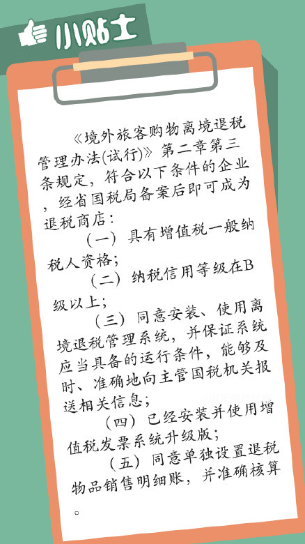 答:稅務總局日前發布境外旅客購物離境退稅管理辦法明確,境外旅客在離境口岸離境時,對其在退稅商店購買的退稅物品可退還增值稅。這里的退稅商店是指報省國稅局備案、境外旅客從其購買退稅物品離境可申請退稅的企業。如何申請成為退稅商店?需同時符合五個條件。