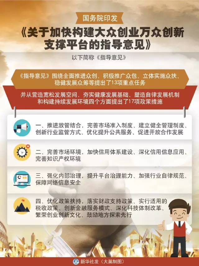 《指導意見》圍繞全面推進眾創、積極推廣眾包、立體實施眾扶、穩健發展眾籌等提出了13項重點任務,并從營造寬松發展空間、夯實健康發展基礎、塑造自律發展機制和構建持續發展環境四個方面提出了17項政策措施:一是推進放管結合,完善市場準入制度、建立健全管理制度、創新行業監管方式、優化提升公共服務、促進開放合作發展。二是完善市場環境,加快信用體系建設、深化信用信息應用、完善知識產權環境。三是強化內部治理,提升平臺治理能力、加強行業自律規范、保障網絡信息安全。四是優化政策扶持,落實財政支持政策、實行適用的稅收政策、創新金融服務模式、深化科技體制改革、繁榮創業創新文化、鼓勵地方探索先行。