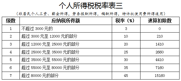 非居民個人的工資薪金所得適用新的減除費用(5000元)和新稅率(換算成月),計算方法與扣繳方式未變。