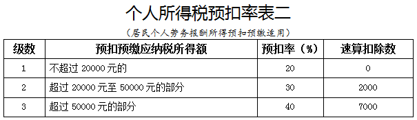 扣繳稅率:勞務報酬所得適用20%至40%的超額累進預扣率,稿酬所得、特許權使用費所得適用20%的比例預扣率。
