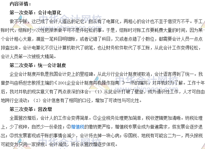 近20年來,會計有五次重大變革。第一次變革,實行會計電算化,這次變革讓會計工作變得輕松,會計人員被極大精簡;第二次變革,統(tǒng)一分行業(yè)的會計制度,會計語言得到了統(tǒng)一;第三次變革,營改增,企業(yè)稅務(wù)處理更加簡單,稅收邏輯更加清晰。第四次變革,推行電子發(fā)票。第五次變革可能引入人工智能。