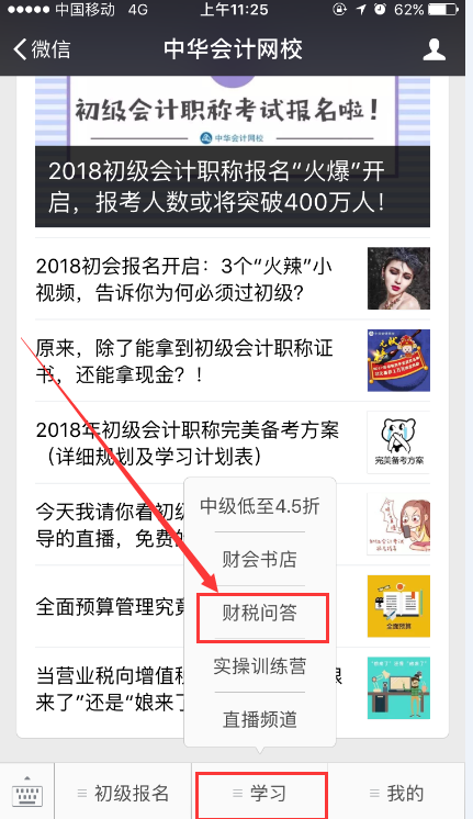 關注后,你的頁面應該是下圖這樣的,然后選擇“學習”中的“財稅問答”,即可與網校財稅大咖溝通啦。
