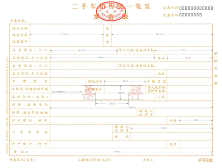 《二手車發(fā)票》為一式五聯(lián)計(jì)算機(jī)票。計(jì)算機(jī)票第一聯(lián)為發(fā)票聯(lián),印色為棕色;第二聯(lián)為轉(zhuǎn)移登記聯(lián)(公安車輛管理部門留存),印色為藍(lán)色;第三聯(lián)為出入庫聯(lián),印色為紫色;第四聯(lián)為記賬聯(lián),印色為紅色;第五聯(lián)為存根聯(lián),印色為黑色。