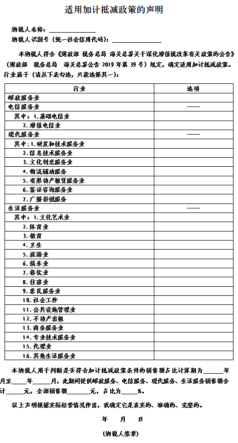 八、按照《財政部稅務(wù)總局 海關(guān)總署關(guān)于深化增值稅改革有關(guān)政策的公告》(財政部 稅務(wù)總局 海關(guān)總署公告2019年第39號)規(guī)定,適用加計抵減政策的生產(chǎn)、生活性服務(wù)業(yè)納稅人,應(yīng)在年度首次確認適用加計抵減政策時,通過電子稅務(wù)局(或前往辦稅服務(wù)廳)提交《適用加計抵減政策的聲明》(見附件)。適用加計抵減政策的納稅人,同時兼營郵政服務(wù)、電信服務(wù)、現(xiàn)代服務(wù)、生活服務(wù)的,應(yīng)按照四項服務(wù)中收入占比最高的業(yè)務(wù)在《適用加計抵減政策的聲明》中勾選確定所屬行業(yè)。
