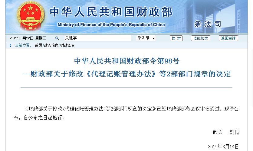 《財(cái)政部關(guān)于修改<代理記賬管理辦法>等2部部門規(guī)章的決定》已經(jīng)財(cái)政部部務(wù)會(huì)議審議通過,現(xiàn)予公布,自公布之日起施行。
