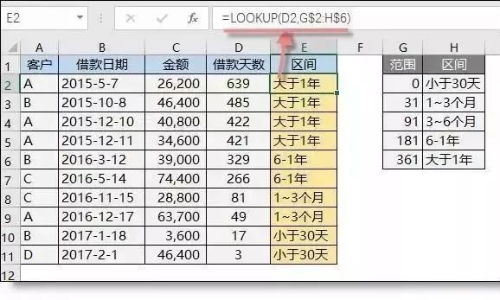 =LOOKUP(D2,{0,"小于30天"147331,"1~3個月"147391,"3~6個月"1473181,"6-1年"1473361,"大于1年"})