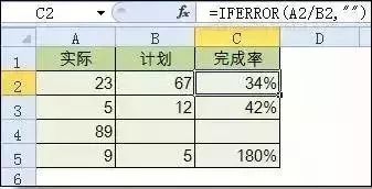 如下圖所示,要求根據B的實際和C列的預算數,計算完成率。
