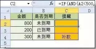 =IF(AND(A2<500,B2="未到期"),"補款","")