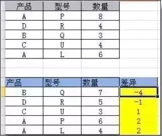 如下圖所示,要求核對兩表中同一產品同一型號的數量差異,顯示在D列。