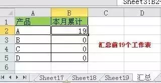 如下圖所示,要求在匯總表里設置合計公式,匯總前19個工作表B列的和。