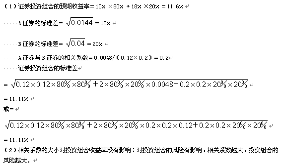 (2)當A證券與B證券的相關系數為0.5時,投資組合的標準差為12.11%,結合(1)的計算結果回答以下問題:①相關系數的大小對投資組織收益率有沒有影響?②相關系數的大小對投資組合風險有什么樣的影響?