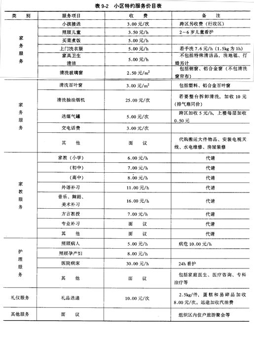 對于物業(yè)管理企業(yè)管轄區(qū)內(nèi)的物業(yè)產(chǎn)權(quán)人、使用人需要的特殊服務(wù)的收費(fèi),管理部門統(tǒng)一制訂收費(fèi)標(biāo)準(zhǔn),明碼實(shí)價,雙方自愿。如某物業(yè)管理小區(qū)特約服務(wù)項(xiàng)目及收費(fèi)標(biāo)準(zhǔn)如圖表。