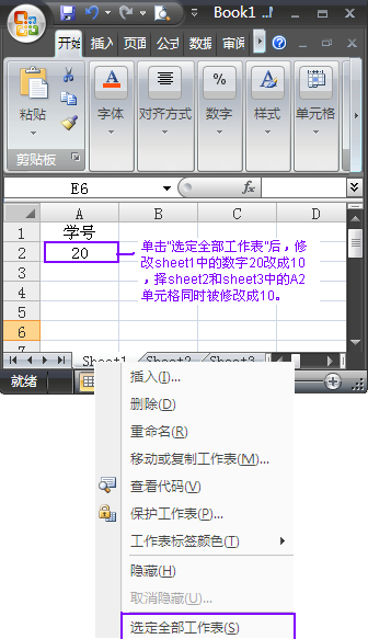 在某一個工作表標簽上右擊,在彈出的快捷菜單中選擇“選定全部工作表”,然后在某一張工作表完成修改,則所進行的操作對所有的工作表有效,其他工作表就會自動地完成對應修改。如下圖所示: