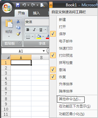 單擊快速訪問工具欄旁邊的“自定義快速訪問工具欄”。單擊“其他命令”。如下圖1