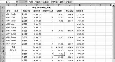 要計算銷售部2001年5月加班費情況。則在F15種輸入公式為: