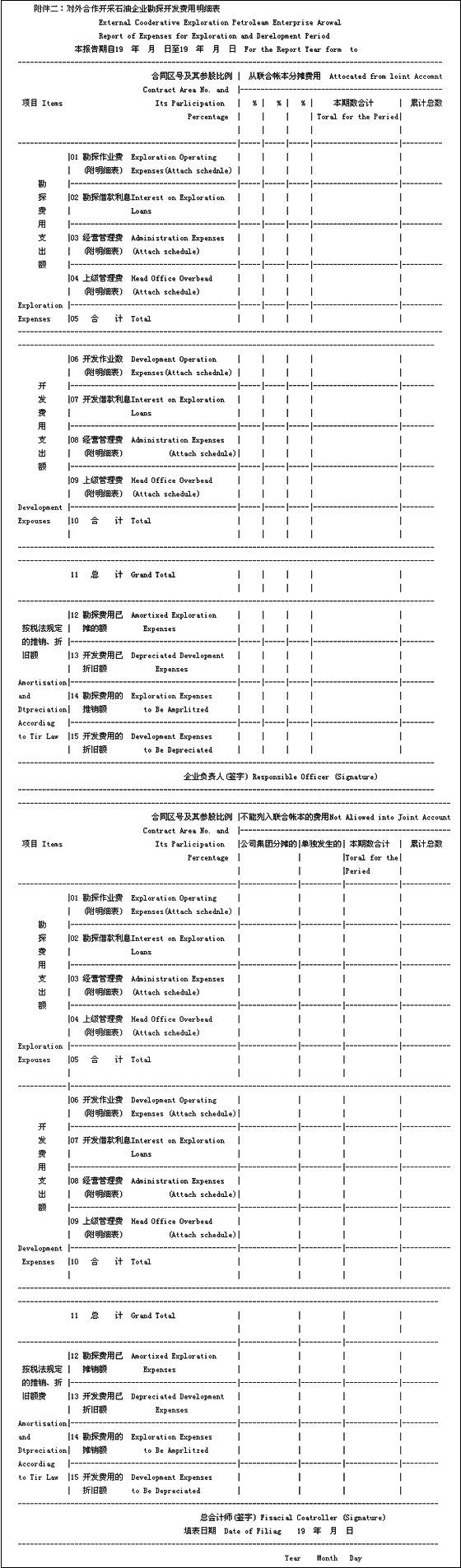 本表作為從事對外合作石油企業年度所得稅申報表的附表。從聯合帳本分攤來的費用請按合同區填區(如表上有百分比的三欄不夠填寫,請縮小原欄,再加欄);不列入聯合帳本的費用,則按公司集團分攤費用和企業單獨發生的費用兩部分填寫。填寫說明如下: