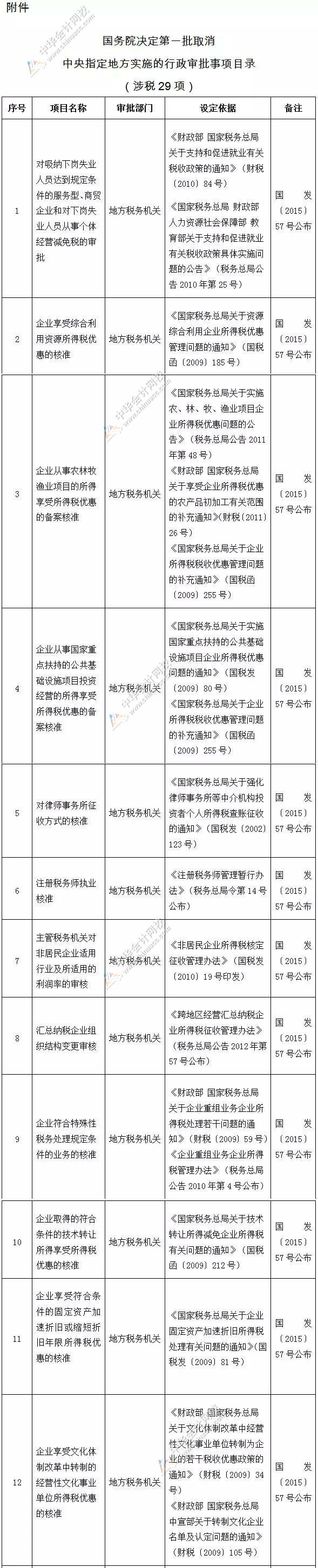 《國務院關于第一批取消62項中央指定地方實施行政審批事項的決定》(國發〔2015〕57號)公布取消62項中央指定地方實施的行政審批事項。其中,涉及取消29項中央指定地方稅務機關實施的稅務行政審批事項。