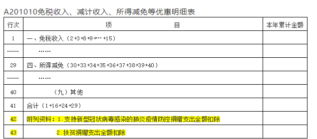 三、附表A201010新增的“附列資料”第42行和第43行不參與計算,第41行“合計”(即免稅收入、減計收入、所得減免等合計)不含第42行和第43行