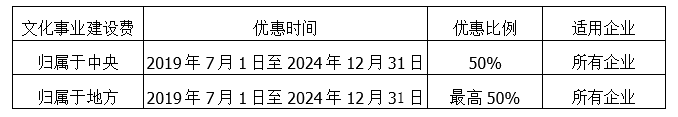 4)月銷售額低于10萬元或季度銷售額低于30萬元免征增值稅,企業繳納的文化事業建設費不免征,根據財稅【2019】46號規定可以享受最高減征50%的優惠;