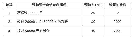減除費用:預扣預繳稅款時,勞務報酬所得每次收入不超過4000元的,減除費用按800元計算;每次收入4000元以上的,減除費用按收入的20%計算。