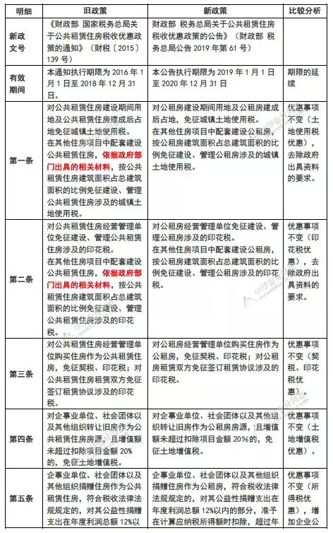 分析:財政部 稅務總局2019年61號公告是財稅〔2015〕139號的延續文件,優惠事項差異不大,主要差異為:文件表述上進行了適當修改,取消了政府出具資料的硬性規定,公益捐贈支出按照新政策修訂為“準予結轉以后三年內在計算應納稅所得額時扣除”,將“市、縣人民政府批準建設(籌集)的公租房”納入優惠范圍。具體對比情況如下: