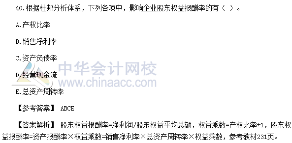 【答案解析】股東權益報酬率=凈利潤/股東權益平均總額,權益乘數=產權比率+1,股東權益報酬率=資產報酬率×權益乘數=銷售凈利率×總資產周轉率×權益乘數。