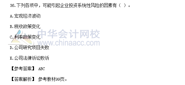 【答案解析】系統風險也稱為不可分散風險,是指某些因素引起證券市場上所有證券報酬波動的可能性,例如:宏觀經濟波動,稅收政策改革、利率政策變革、匯率政策調整等。