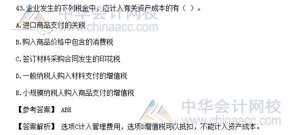 【答案解析】選項C計入管理費用,選項D增值稅可以抵扣,不能計入資產成本。