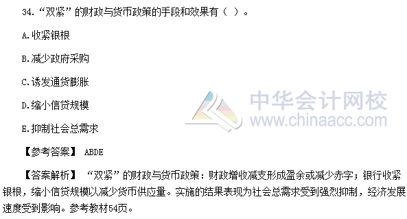 【答案解析】“雙緊”的財政與貨幣政策:財政增收減支形成盈余或減少赤字;銀行收緊銀根,縮小信貸規模以減少貨幣供應量。實施的結果表現為社會總需求受到強烈抑制,經濟發展速度受到影響。