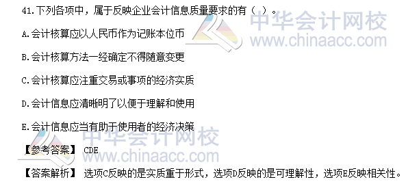 【答案解析】選項B,反映的是可比性原則,選項C反映的是實質重于形式,選項D反映的是可理解性,選項E反映相關性。