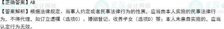依照法律規定或按照雙方當事人約定、民事法律行為的性質,應當由本人親自實施的民事法律行為,不得代理。如訂立遺囑、婚姻登記、收養子女。