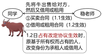 【示例3】同學的牛賣給穩(wěn)老師,同學對穩(wěn)老師說:“它現(xiàn)在已經(jīng)是你的牛了,但是再借我用三天”,穩(wěn)老師同意。同學與穩(wěn)老師之間達成兩份協(xié)議,一是買賣牛的合同;二是占有改定協(xié)議(借用牛合同),物權(quán)自第二份協(xié)議“借用合同”生效時移轉(zhuǎn)。