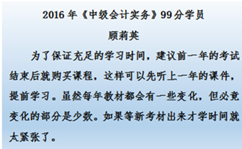 2.學習網(wǎng)校2017中級會計職稱課程,網(wǎng)校課程都有老師的配套講義,講義是非常好的學習資料,如果手里沒有2016年教材,聽課、看講義也是完全可以滿足本階段備考需求的哦!萬眾期待的2017年中級會計職稱基礎學習、強化提高課程已經(jīng)開通,多位老師課程隨你選聽,現(xiàn)在購買2017年中級會計職稱精品班贈強化提高課程及機考操作技巧,助你全面提高備考效果。去購課>> 試聽>>