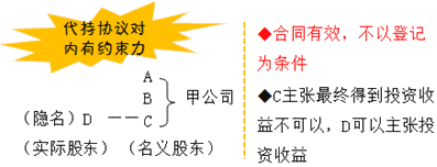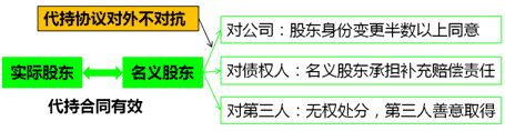 | 對公司、其他股東 | 實際出資人未經公司其他股東半數以上同意,請求公司變更股東、簽發出資證明書、記載于股東名冊、公司章程并辦理公司登記機關登記的,法院不予支持。★ 【分析】代持協議對公司和其他股東是沒有約束力的,所以要想成為顯名的股東,必須參照有限責任公司對外轉讓出資的要求處理。 |