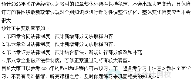 2026注冊會計師預習備考已經提上日程了,很多考生選擇在上一年考試結束之后就投入到新考期的學習當中。網校老師也為大家整理了2026注冊會計師《經濟法》教材變動預測,針對可能變動的考點可以先不學!