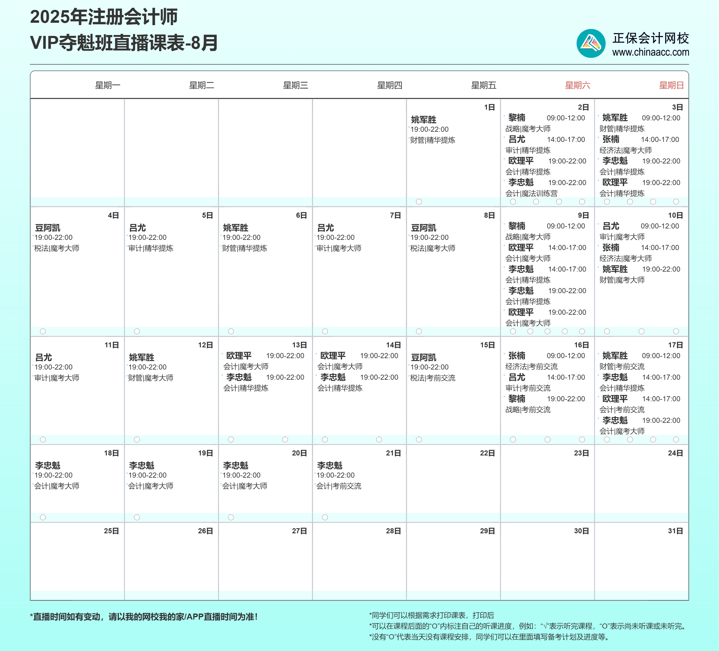 2025年注冊會計師考試時間為8月23日-24日,VIP奪魁班8月直播課表安排已公布!備考學習自制力差、基礎薄弱或想聽直播課的各位同學,快來沖刺學習吧!