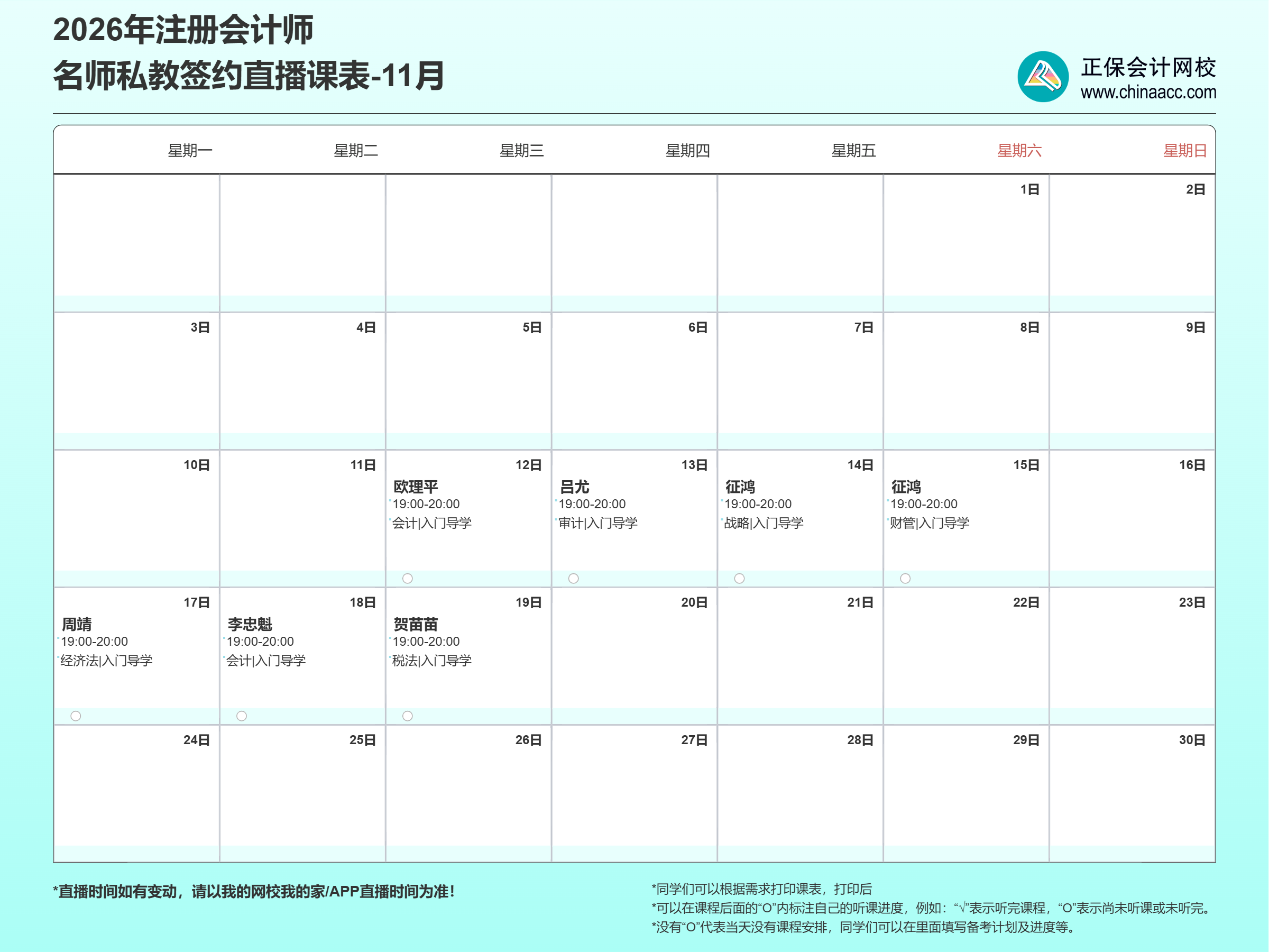 2026年注冊會計師名師私教簽約班11月直播課表安排已出爐,快來查看!名師授課,1V1嚴管督學,精準規劃學習路徑,讓你輕松高效學注會。