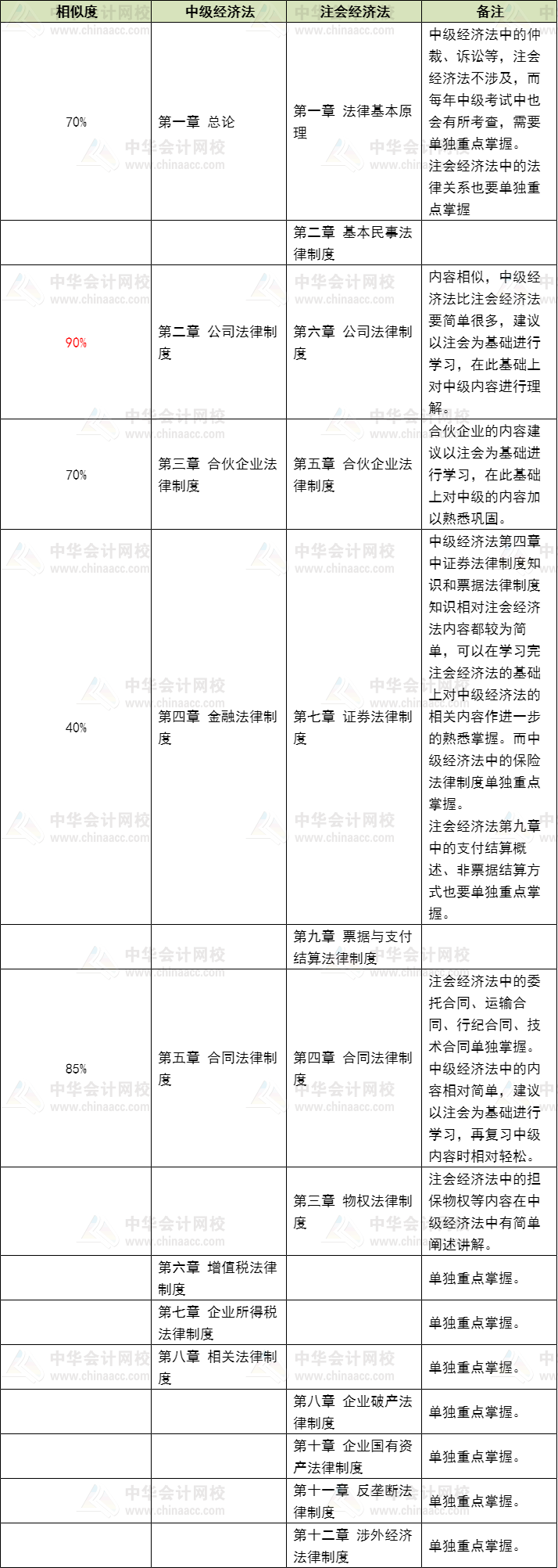 然后,從內容上來看一下注會的《經濟法》與中級會計職稱的《經濟法》有哪些重合: