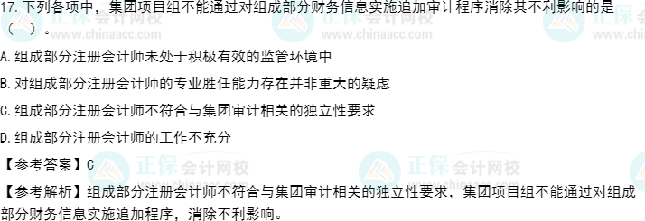 【點評】本題考核“了解組成部分注冊會計師”這個知識點。該題目所涉及知識點在下列正保會計網校(www.sgjweuf.cn)222年注冊會計師考試輔導《審計》中均有體現:楊聞萍老師【暢學旗艦班/高效實驗班】基礎精講第十六章第2講;徐永濤老師【暢學旗艦班/高效實驗班】基礎精講第十六章第2講;陳楠老師【暢學旗艦班/高效實驗班】基礎精講第四篇第五節第3講;荊晶老師【VIP簽約特訓班】逐章精講第63講 對集團財務報表審計的特殊考慮(2022.04.23);逐章精講課后作業第9題;王茂林老師【暢學旗艦班/超值精品班】基礎精講第十六章第3講;張楠老師【暢學旗艦班/超值精品班】基礎精講第十六章第1講;呂尤老師【C位奪魁】專題精講(二十二):第十六章 對集團財務報表審計的特殊考慮(2022.05.03);專題精講課后作業第12和13題;高效實驗模擬試題(二)簡答題第2題;高效實驗摸底試卷(三)多選題第10題。徐永濤老師主編《審計應試指南》第87頁表4-13;楊聞萍、王茂林老師主編《審計經典題解》第115頁表16-4、做習題86頁單選4。