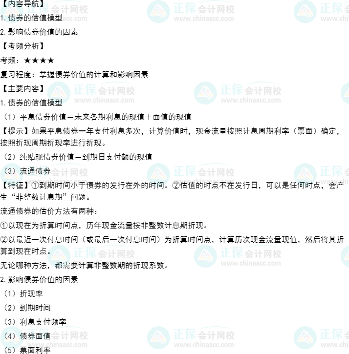 本章屬于價值評估應用單元的第二章,主要解決了兩種典型的有價證券(股票和公司債券)的價值評估、收益率確定等問題,是對前面章節基礎原理的運用,難度不大。主要的考點有價值評估方法、價值的影響因素、報酬率(收益率)的計算。從歷年的考試情況來看,本章分值不多,屬于非重點章節。