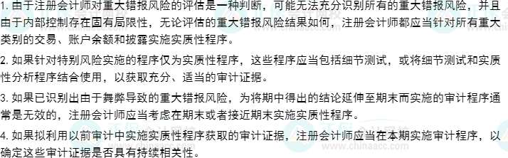 針對財務報表層次重大錯報風險的總體應對措施、針對認定層次重大錯報風險的進一步審計程序、控制測試中如何考慮以前審計獲取的審計證據、實質性程序