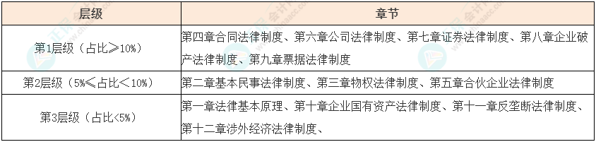 注會《經濟法》教材分為四大部分:第一編法律概論(第一章)、第二編民事法律制度(第二-四章)、第三編商事法律制度(第五-九章)、第四編經濟法律制度(第十-十二章)。依據各章歷年考查分值的高低,可以將全部章節分為三個層級,具體層級劃分如下: