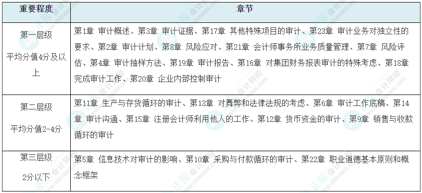 注會(huì)《審計(jì)》教材共有23章內(nèi)容,根據(jù)歷年題目各章分值分布情況統(tǒng)計(jì),可以將教材劃分為三個(gè)層級(jí):