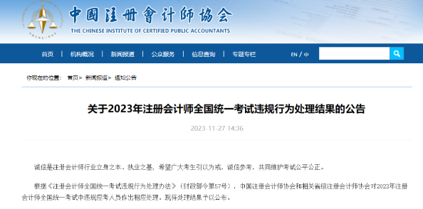 近日,中國注冊會計(jì)師協(xié)會發(fā)布《關(guān)于2023年注冊會計(jì)師全國統(tǒng)一考試違規(guī)行為處理結(jié)果的公告》,公告顯示,18名考生被取消成績,一起來看具體公告。