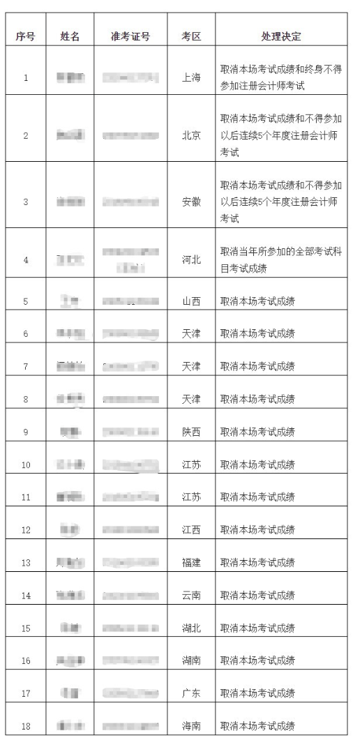 公告中表示:18名考生被取消成績,其中1名考生被處理決定:取消本場考試成績和終身不得參加注冊會計(jì)師考試!2名考生被處理決定:取消本場考試成績和不得參加以后連續(xù)5年度注冊會計(jì)師考試;1名考生被取消當(dāng)年所參加的全部考試科目成績。