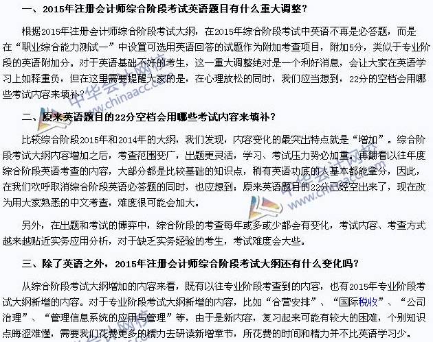 2015年注冊會計師綜合階段考試大綱的變化讓很多人都感到意外,前兩年占分達到22分的英語題目在今年有重大調整。這個比較大的調整對今年的考生來說,是好消息還是壞消息?正保會計網校老師結合2015年注冊會計師綜合階段考試大綱及往年大綱的對比,專門就綜合階段英語重大調整的問題為大家做深入的分析、解讀,并在必要的地方給大家以提醒,一切都為了大家能順利完成今年的注冊會計師考試。