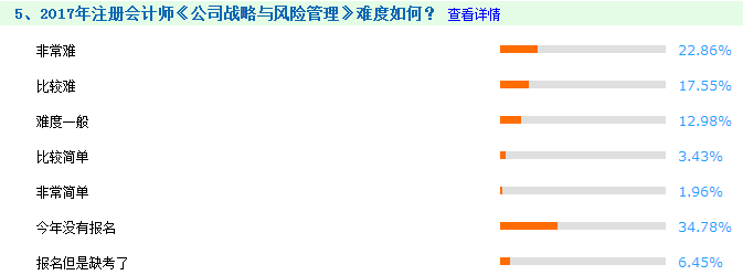 正保會計網(wǎng)校對《公司戰(zhàn)略》考試難易程度做了一份問卷調(diào)查,共計有2655人參與此次調(diào)查,調(diào)查顯示,22.86%的考生認為試題非常難,17.55%的考生認為試題比較難,只有12.98%的考生認為考試難度一般。對比去年的調(diào)查結(jié)果,可以看出《公司戰(zhàn)略》考試略微上升。